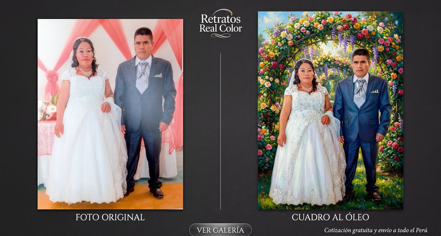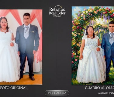 "Espectacular. El parecido con nuestra foto de boda es total, pero la textura del óleo le da una vida que ninguna cámara logra. Ver el detalle en mi vestido y en el traje de mi esposo nos emocionó muchísimo. Una obra de arte que ahora es el centro de nuestra casa. ¡Gracias por tanta fidelidad!" — Familia Quispe. (SJL)